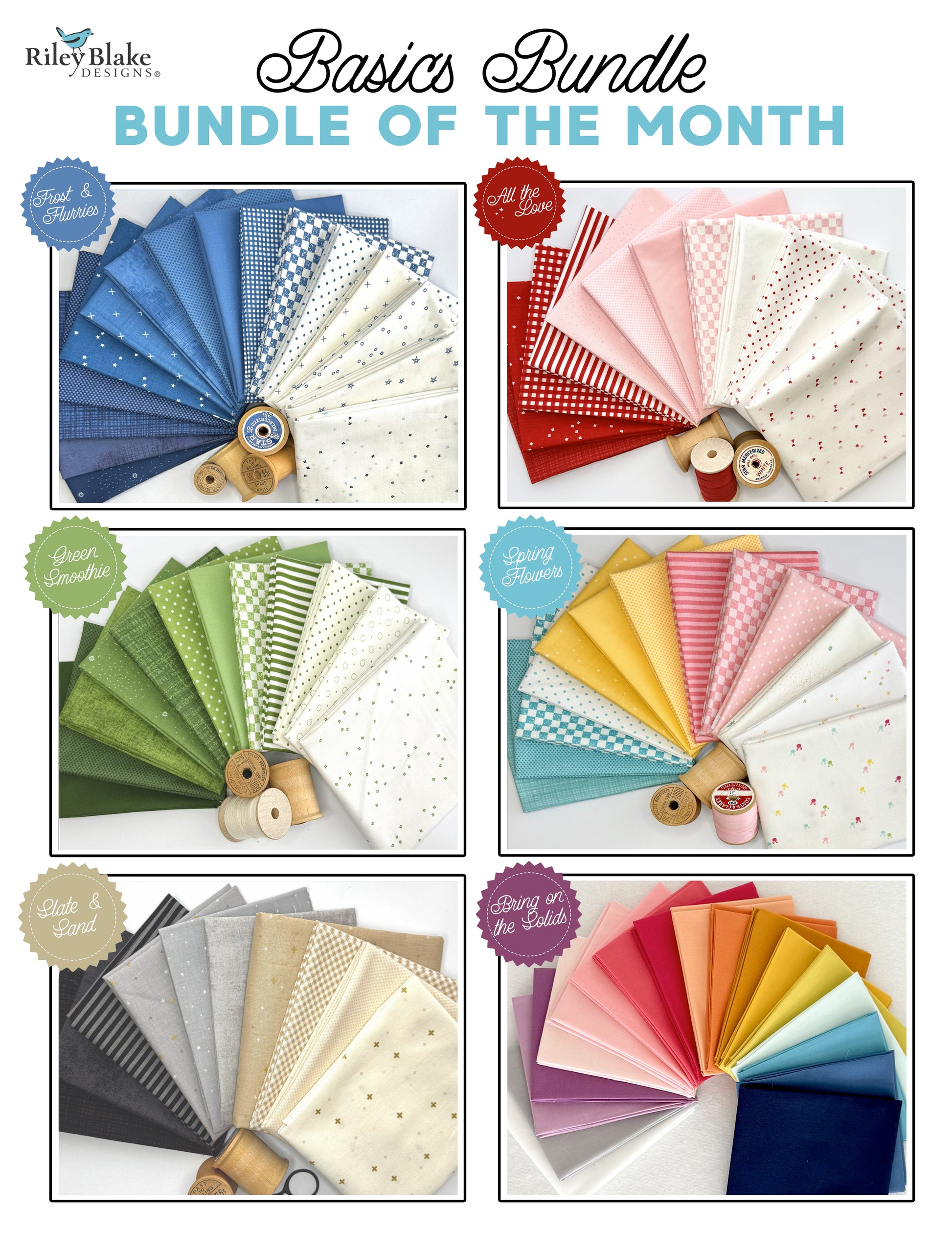 • Photos show an example of a monthly bundle; fabrics may vary